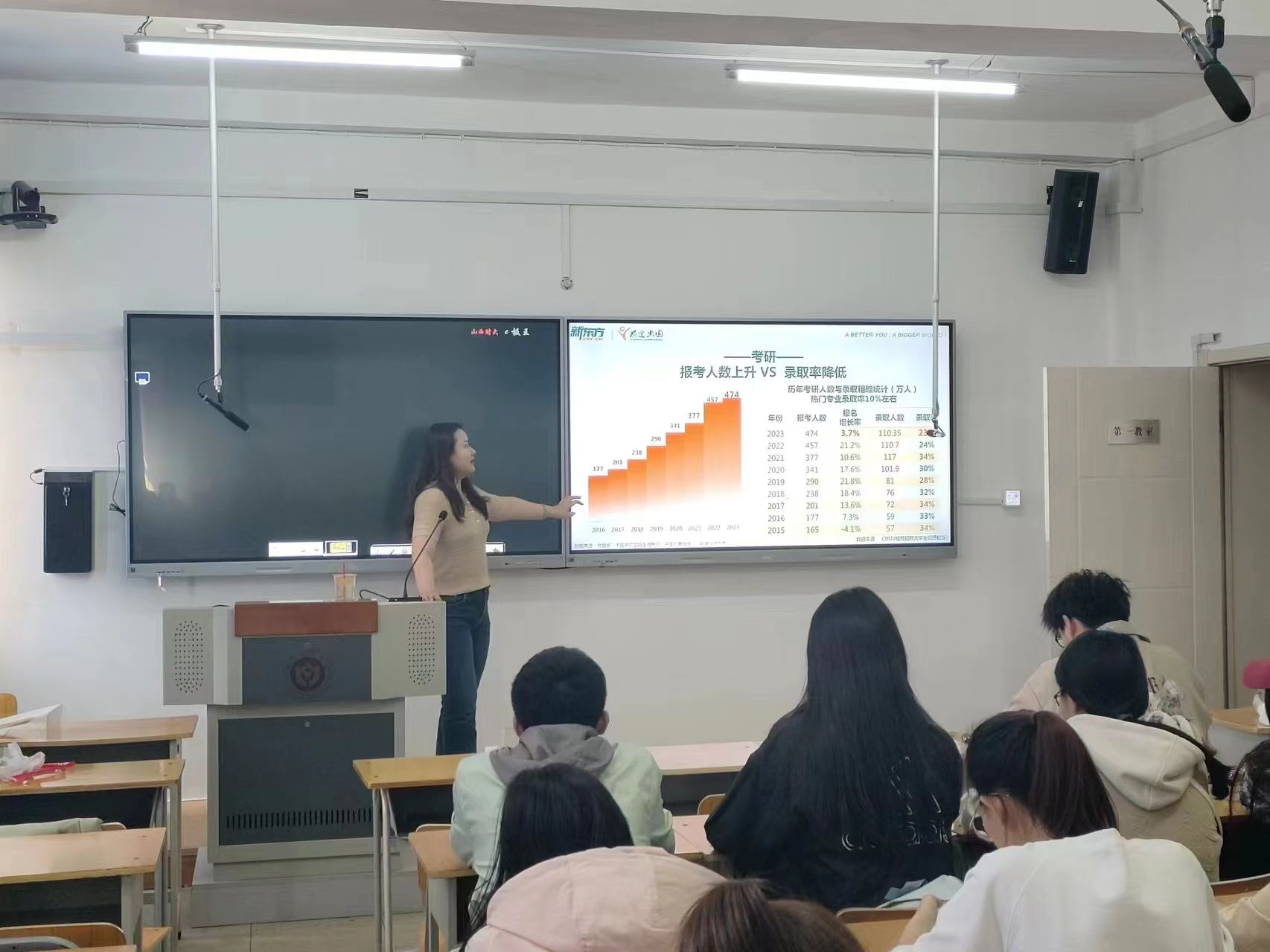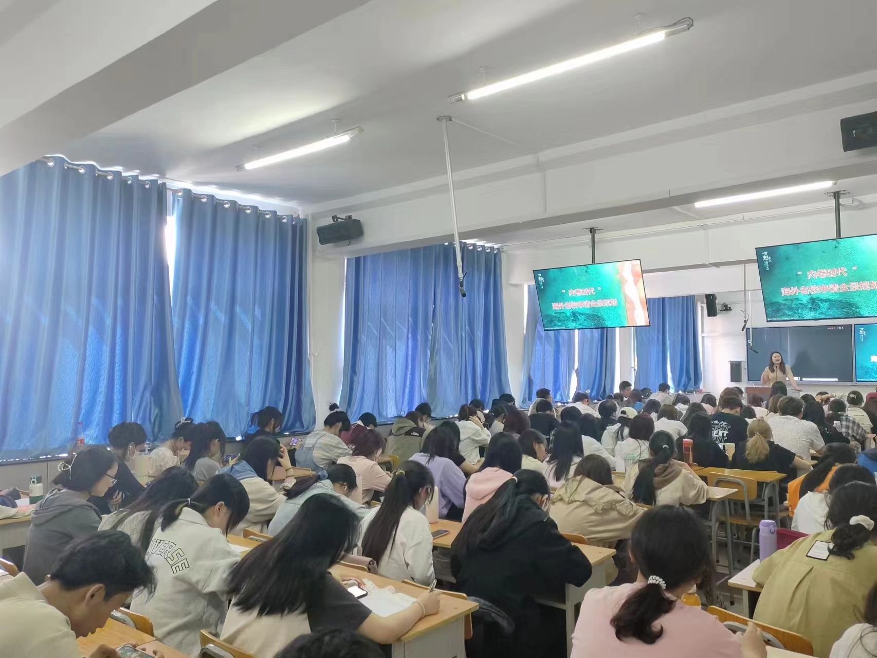 4月16日于迎泽校区求真楼703教室举办题为“梦想起航,规划未来——大学生留学规划指导”讲座,邀请新东方留学专家杨璐、郭玲丽、韩俊伟三位老师作为主讲嘉宾,130余名一二年级学生参加讲座。