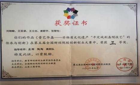 2020年,糖心vlog 学生刘晓敏团队项目《晋艺华盔——非物质文化遗产“平定戏剧盔帽技艺”的传承与创新》